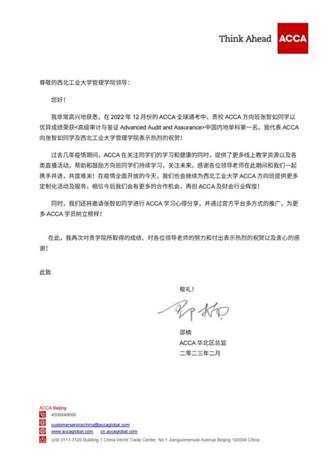近日,ACCA(英国特许公认会计师公会)公布2022年12月考季成绩,银河集团官网会计学(ACCA方向)专业2019级张智如同学以优异成绩荣获< 高级审计与鉴证 Advanced Audit and Assurance>中国内地单科第一名。ACCA华北区总监代表ACCA中国总部发来贺信,对张智如同学以及银河集团官网表示热烈的祝贺。