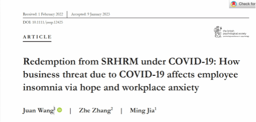 近日,银河集团官网副教授王娟与合作者的研究成果“Redemption from SRHRM under COVID-19: How business threat due to COVID-19 affects employee insomnia via hope and workplace anxiety”在《Journal of Occupational and Organizational Psychology》期刊上正式发表。《Journal of Occupational and Organizational Psychology》是组织行为领域国际顶级期刊,是ABS四星级期刊。这也是公司教师首次在这一级别的组织行为与人力资源管理类国际高水平期刊上发表研究成果。