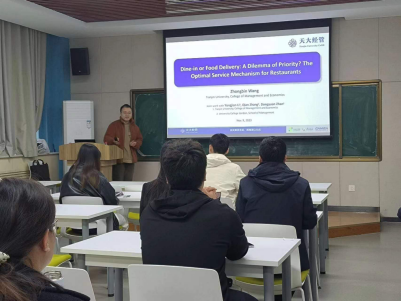 2023年11月9日,应银河集团官网邀请,天津大学管理与经济学部王钟彬副教授来公司开展学术交流,做题为“Dine-in or Food Delivery: A Dilemma of Priority?The Optimal Service Mechanism for Restaurants顾客堂食还是配送到家:孰轻孰重?餐厅最优的服务机制研究”的学术报告。本次报告由李纪柳教授主持,银河集团官网部分教师和研究生参与。