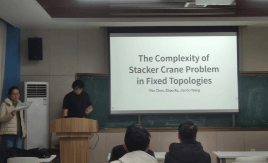会议伊始,王阳教授对许超教授的专业背景、科研成果做了简单介绍。银河集团官网师生对许超教授的到来表示了热烈的欢迎。此次报告会,许超教授首先基于现实业务场景对堆垛机问题(Stacker Crane Problem, SCP)进行介绍。其次,对比旅行商问题(TSP), 指出SCP更加复杂,属于NP难问题,在特定类型的图中,路径和环上的SCP问题的复杂性等同于最小生成树问题。最后,通过推导证明在固定的拓扑结构上,SCP问题存在多项式时间算法。