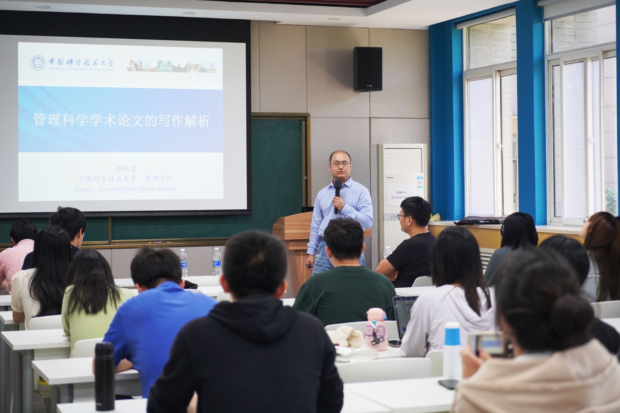 报告会中,郭晓龙教授向同学们生动地阐述了管理研究的价值与挑战,并从论文结构出发,深入浅出地讲授了学术写作的思路及要点。首先,探讨了学术写作三大要素:正确的动机、合理的方法论以及清晰的问题设定;其次,提出了写作过程中需要避免的问题,如假设间的逻辑冲突和不明确的研究目标;此外,讲解了论文的基本结构,包括问题提出、模型建立、结果分析及讨论等环节,并指出了每个部分质量提升的要点;最后,回顾了论文写作的结构化布局及各个部分的关键要素,并向参会师生分享了参考书目与课件。
