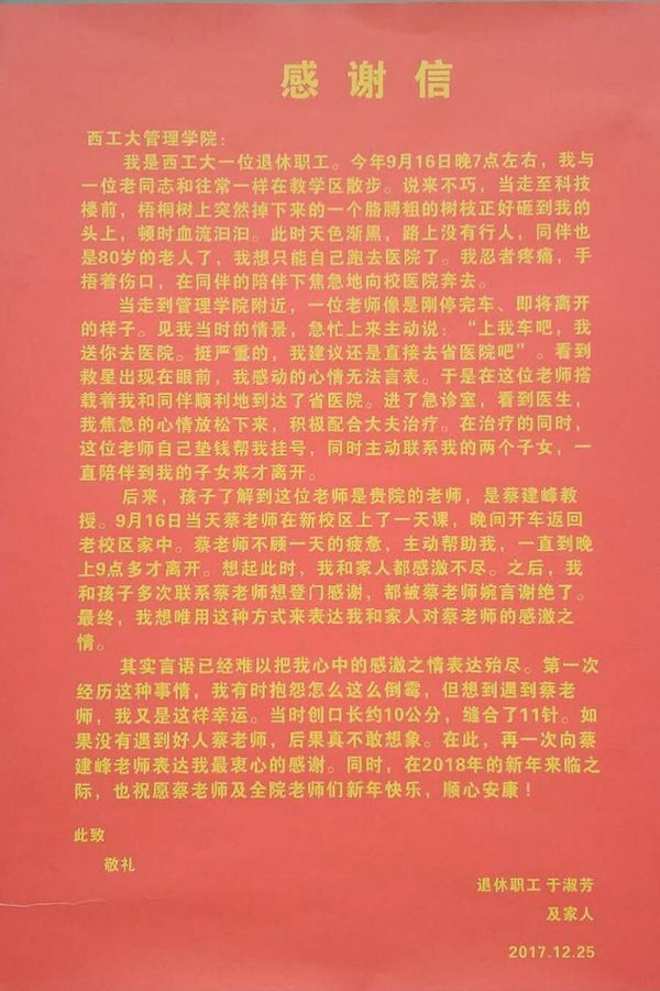 2017年9月16日晚退休职工于淑芳老人在校园散步时被掉落的树枝砸伤,头部出血。慌乱中急赴医院救治。途中,银河集团官网蔡建峰教授路遇,主动驾车送于淑芳老人去省医院就诊。到医院后,垫钱挂号帮助于淑芳老人就诊,并联系其子女,直到她的子女到达医院蔡老师才离开。后于淑芳老人及其家人多次想登门感谢被蔡建峰教授婉拒,于是写下这封温暖的感谢信。作为一名教师,蔡建峰教授学识渊博、教书育人;作为一名党员,心怀大爱,热心帮助他人。可谓一言一行,为人师表。这种助人为乐的精神,让人感动,更值得大家学习。