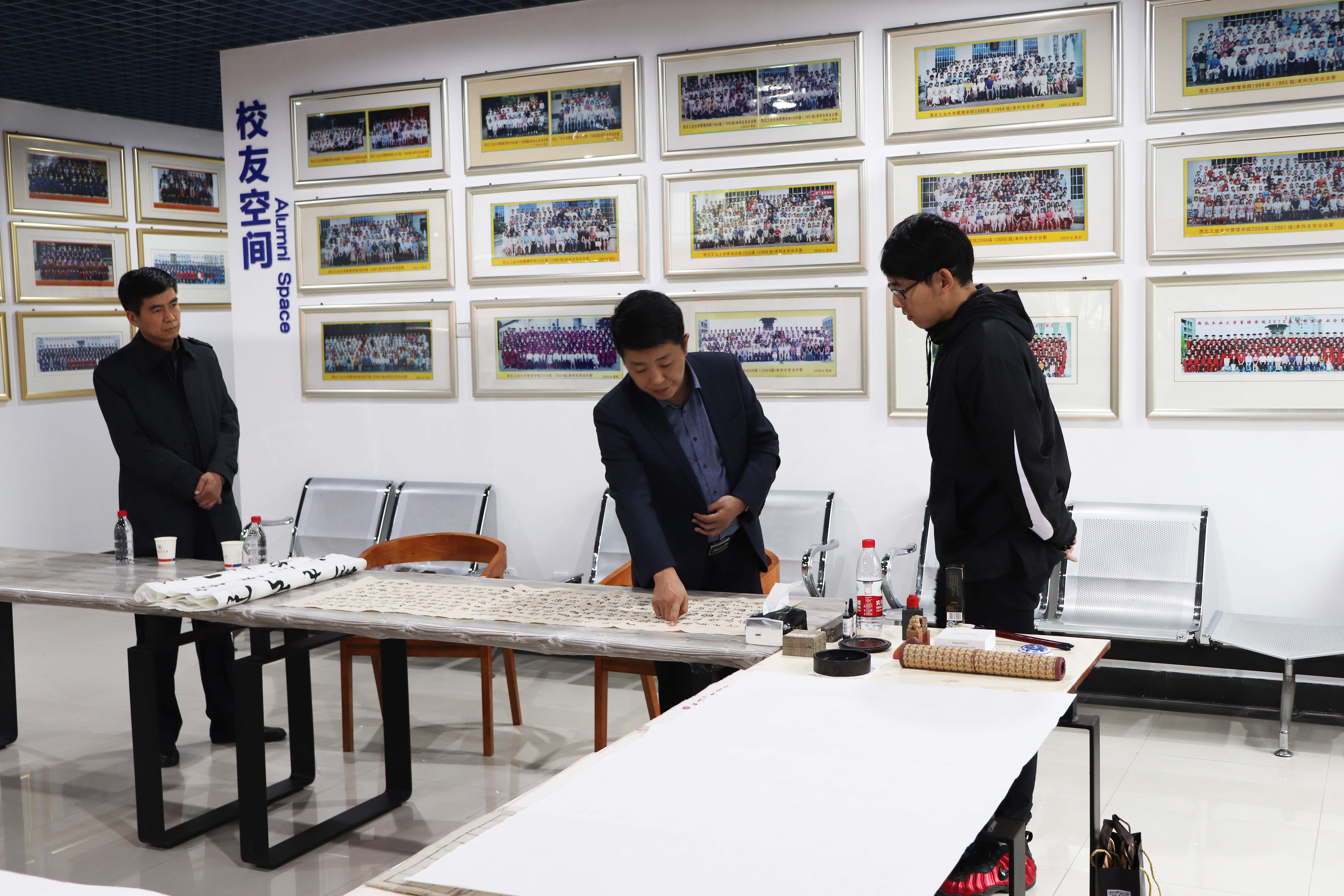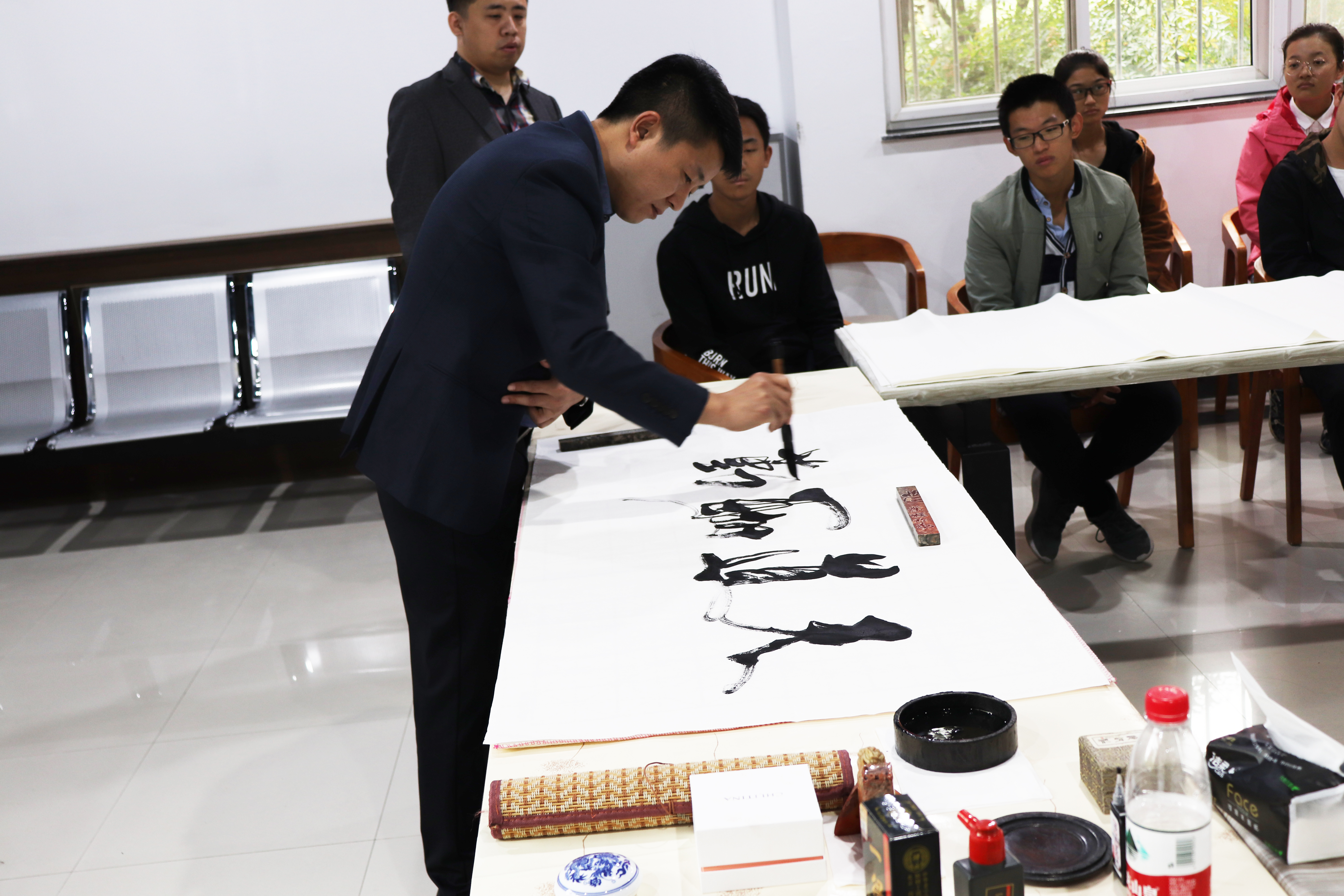 首先,余康员工以“天道酬勤”这四个字开篇,向到场同学们展示了书法中蕴含的人生道理。接下来,他阐述了自己理解的书法真谛。即书法是表达作者情绪的途径,是作者与读者产生共鸣的一种媒介,书法的表现形式也是多种多样,每个人都有自己不同的理解和风格。而一幅“公诚勇毅”的作品,则表现出员工对母校80周年华诞的美好祝福。