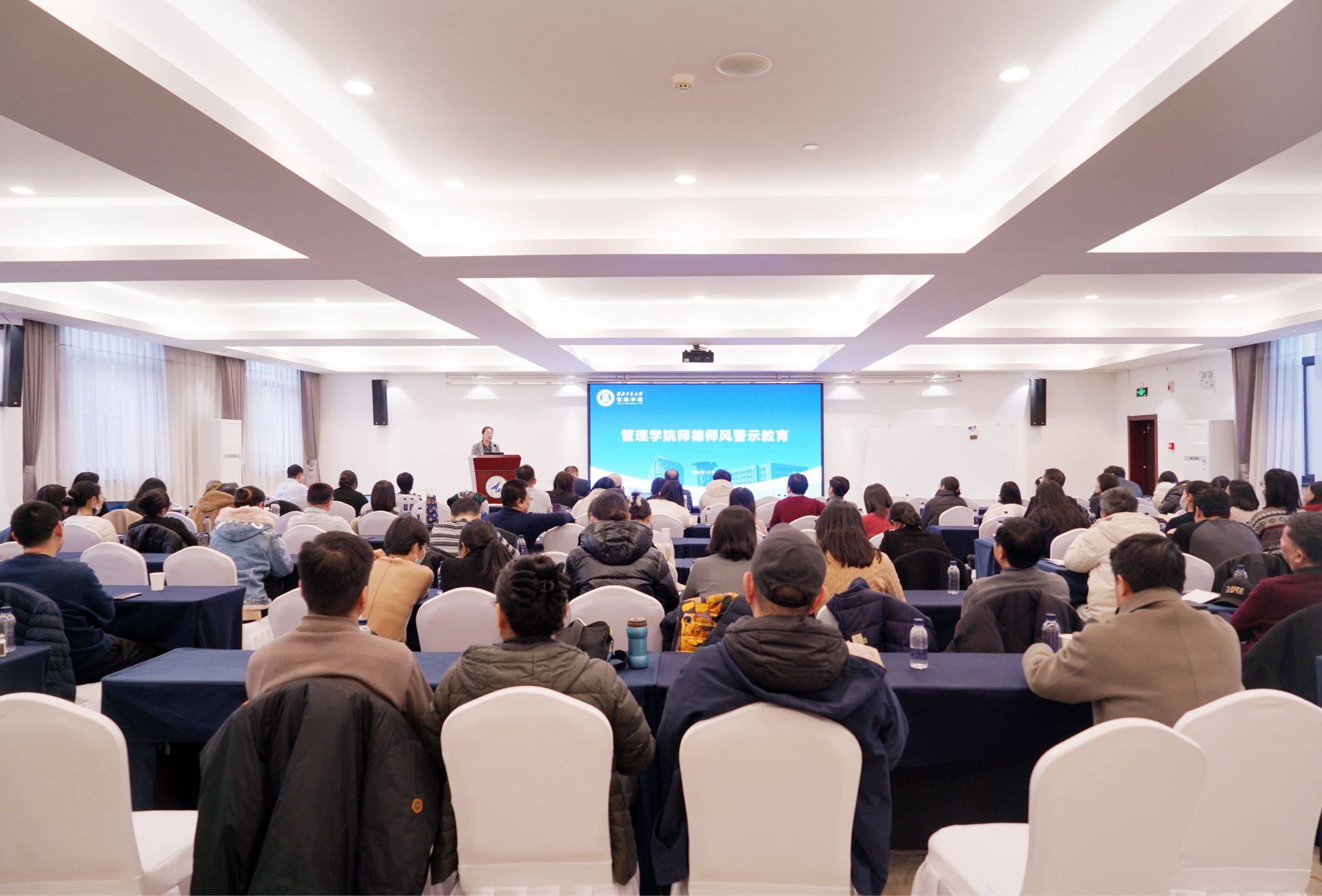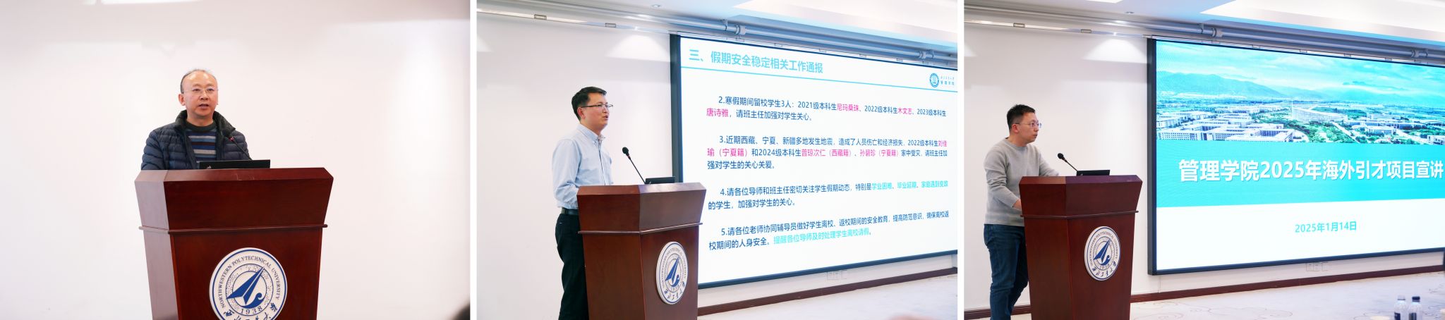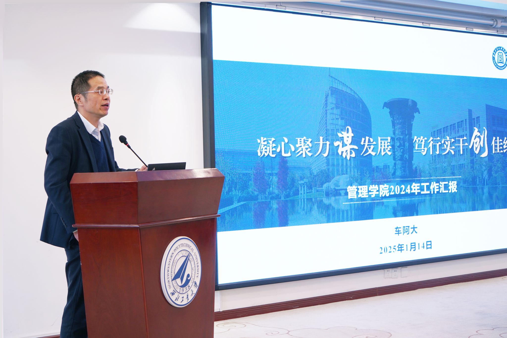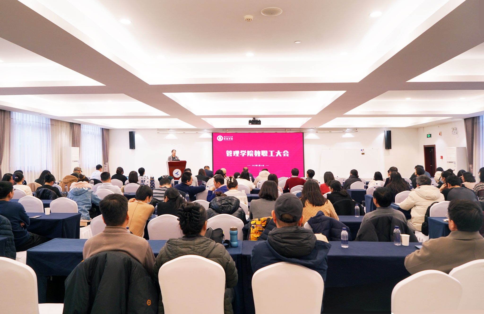 教职工大会上,副经理郭云涛通报专业学位课程、论文复试等培养的相关事宜。党委副书记王海啸通报员工就业情况、“三大赛”校赛备赛情况和寒假期间安全稳定相关工作。经理助理李乘龙对2025年海外引才项目进行宣讲动员。