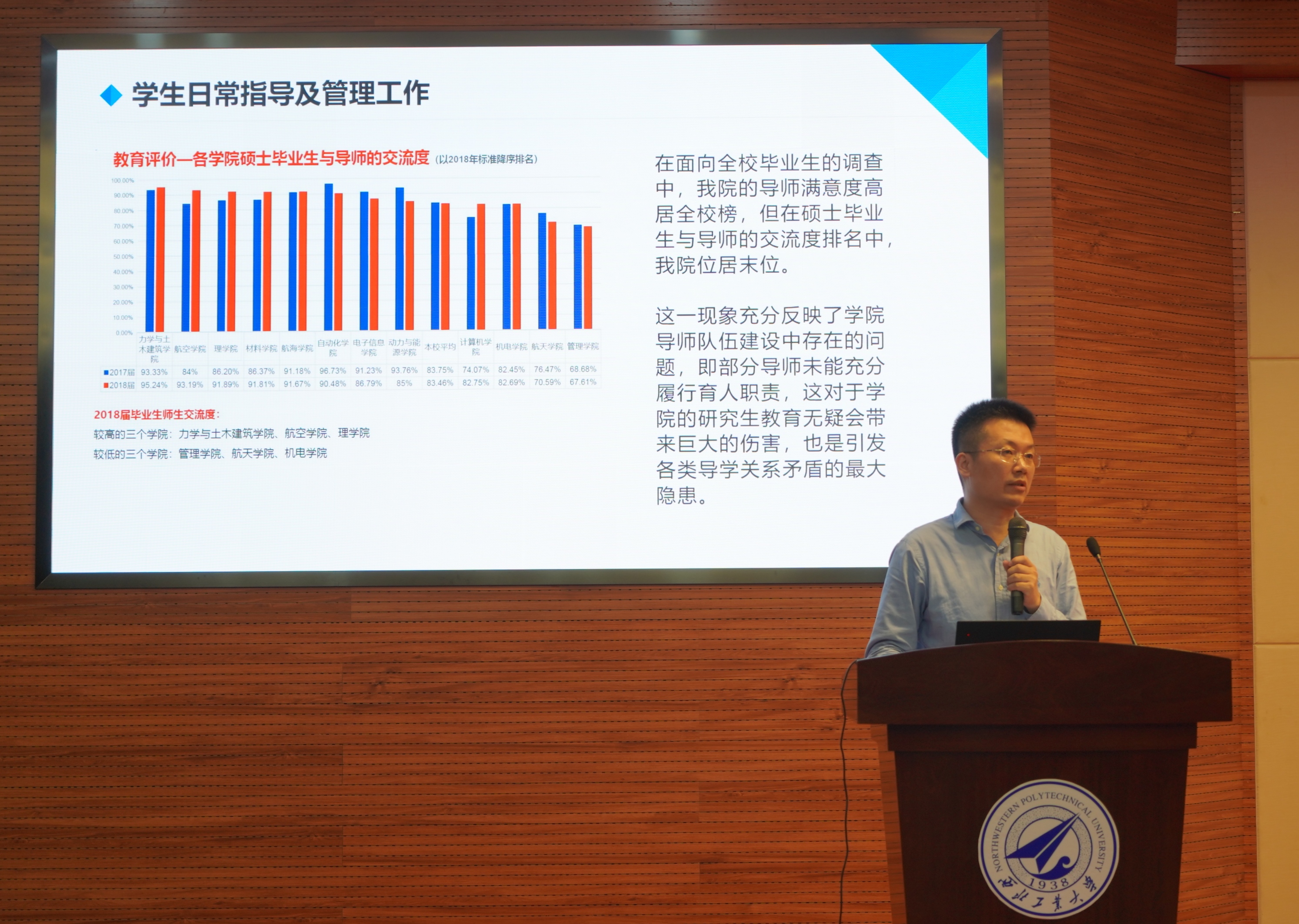 副经理贾明首先对研究生管理工作的开展情况进行了通报,接着,就公司近年来项目申报和立项情况进行了具体分析,通过与兄弟院校申报情况比对,指出当前公司项目申报中的主要问题,并就如何克服困难、规避短板提出了具体举措。副经理郭云涛对公司专业学位的招生报名、培养管理以及社会实践等方面工作进行了详细介绍。希望老师在员工培养过程中结合专业学位员工特点加强管理。经理助理白洁对公司奖学金评定工作的四项新变化做了说明,并就2020届员工就业情况进行了通报。