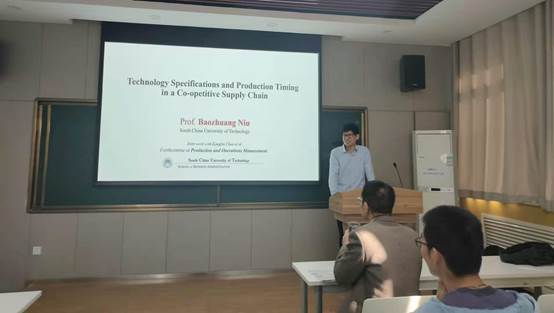 首先,牛保庄教授以代工商HTC和品牌商谷歌关于谷歌手机的生产博弈为例进入报告主题,介绍了竞争供应链中的技术依存和生产时序决策研究的背景。接下来,牛教授重点研究了在自主创新需求波动较大的情形下,代工商与品牌商共生共赢的可行区间。牛教授详细介绍了博弈模型以及市场需求不确定性程度和竞争激烈强度等变量。研究发现,由于存在合作—竞争的关系,推迟生产策略并不总是使代工商或品牌商受益。同时企业对生产时序的决策取决于其自主创新产品的市场需求不确定性程度和成品市场上的竞争激烈强度。