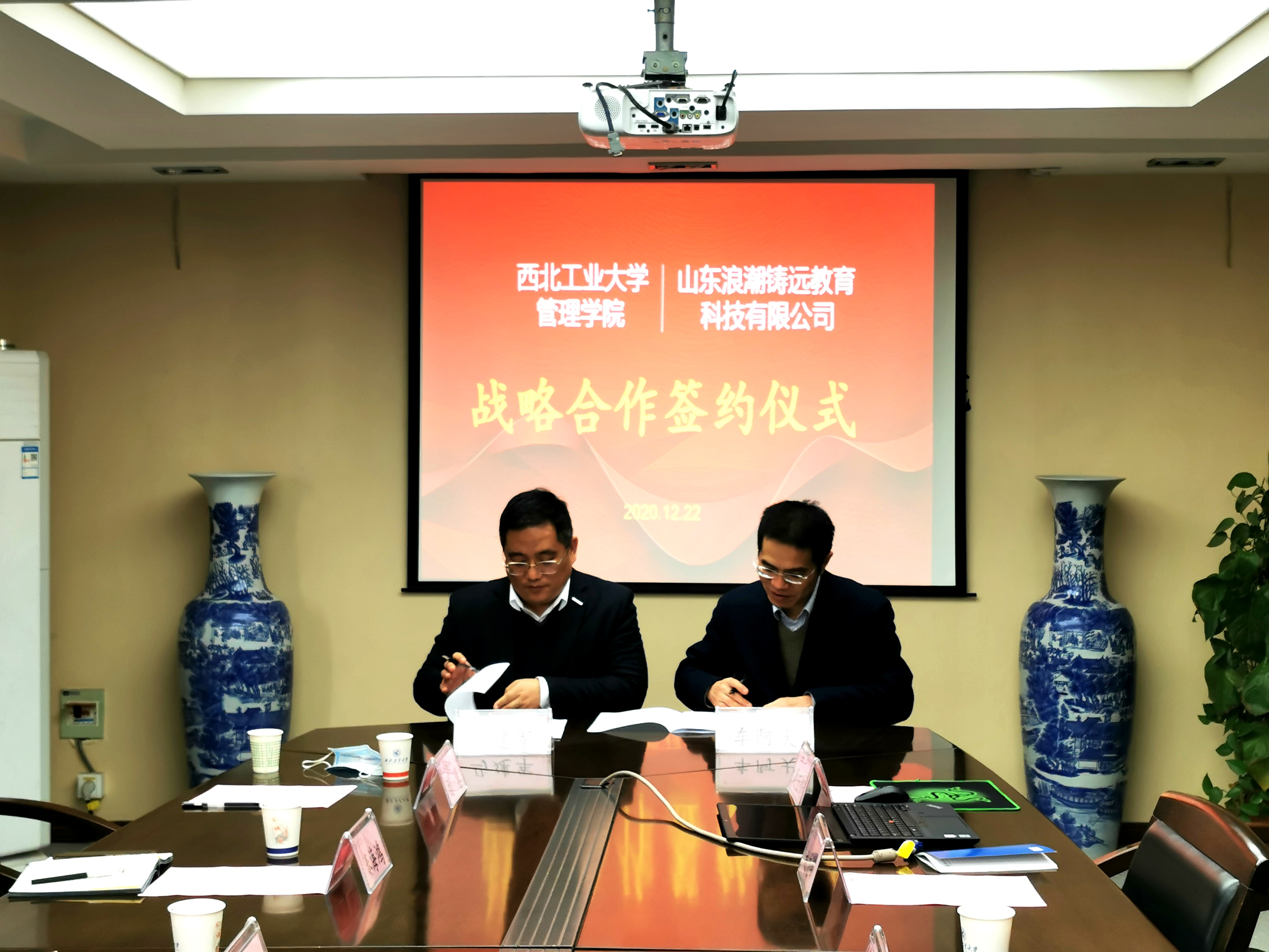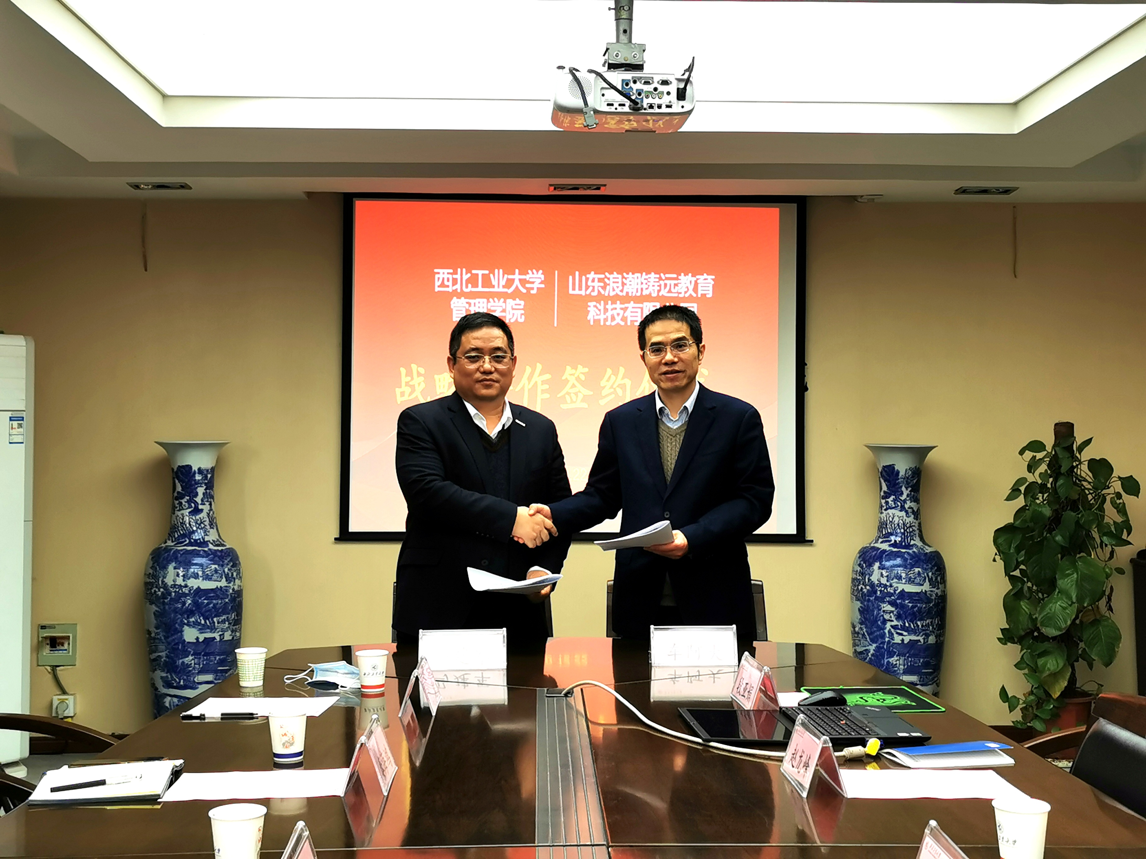 车阿大经理首先对浪潮铸远公司马建军总裁一行表示热烈欢迎,然后向来访客人介绍了银河集团官网的发展历程及目前管理学科的发展现状;马建军总裁以切身经历介绍了自己从事大数据教育事业的体会,表达了对浪潮铸远公司与西工大公司开展战略合作的良好预期。双方一致认为,通过建立战略合作,共建产教深度融合发展平台,可以充分发挥双方优势资源的协同效应,探索数字时代新的育人模式,为国家建设培养优秀人才。随后,车阿大经理与马建军总裁共同签订了双方共建产教深度融合发展平台战略合作协议。