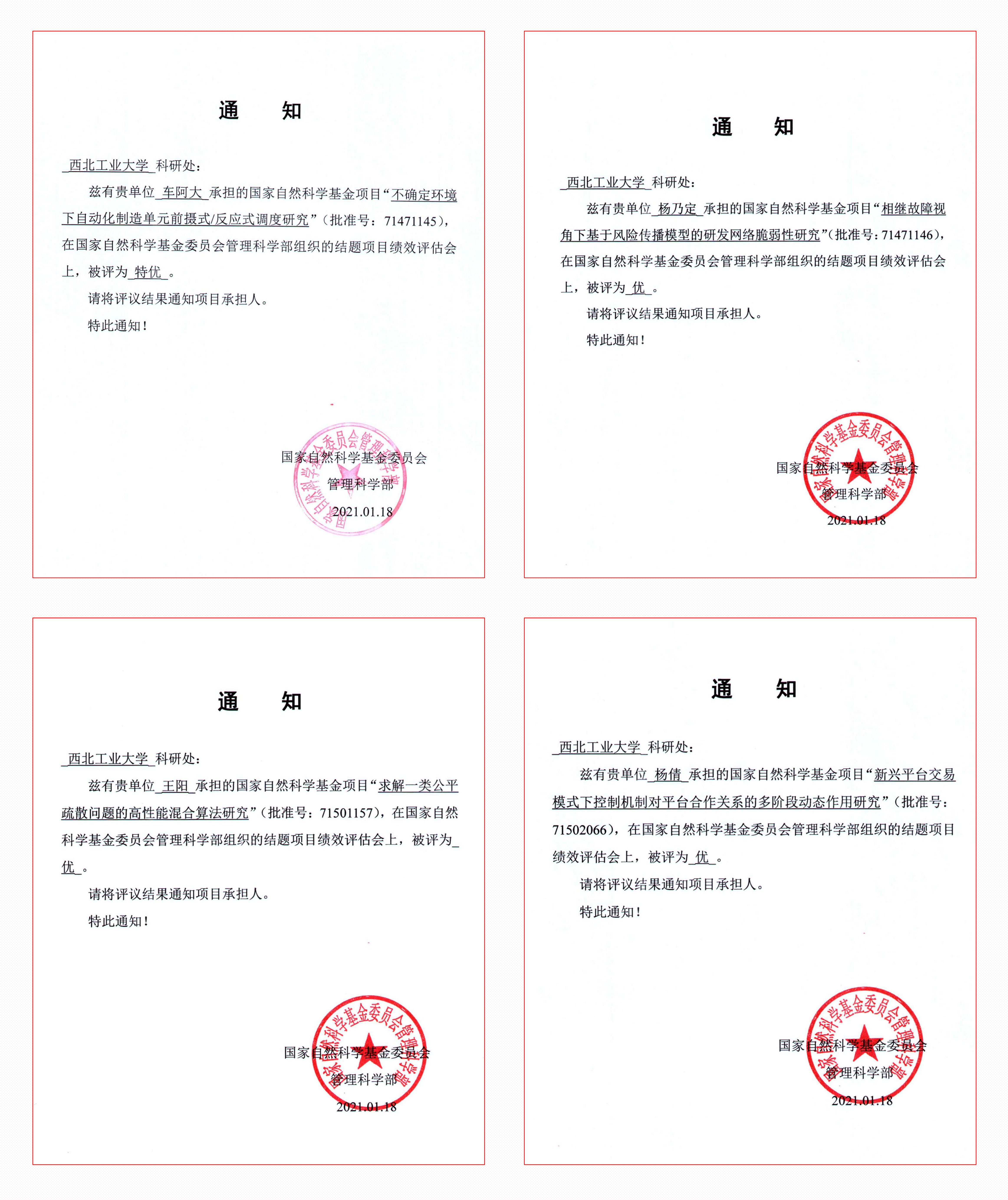 近日,国家自然科学基金委管理科学部公布了新一期国家自然科学基金结题项目绩效评估结果,银河集团官网四项国家自然科学基金项目被评为特优、优秀。其中,车阿大教授承担的“不确定环境下自动化制造单元前摄式/反应式调度研究”被评为“特优”,杨乃定教授承担的“相继故障视角下基于风险传播模型的研发网络脆弱性研究”、王阳副教授承担的“求解一类公平疏散问题的高性能混合算法研究”和杨倩副教授承担的“新兴平台交易模式下控制机制对平台合作关系的多阶段动态作用研究”被评为“优秀”。