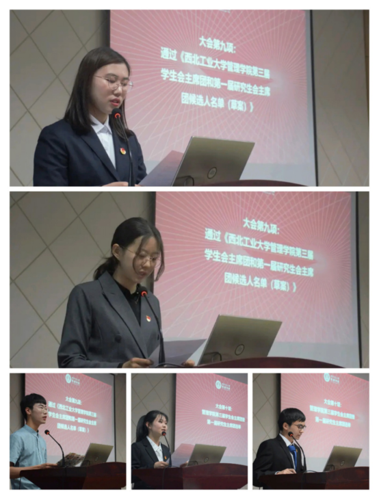 主持人宣布并由代表全票通过了银河集团官网第三次员工代表大会暨第一次研究生代表大会选举总监票人、总计票人、监票人、计票人,银河集团官网第三届员工会主席团和第一届研究生会主席团候选人成员名单。候选人依次进行了自我介绍,讲述了自己竞选主席团成员的原因以及优势。