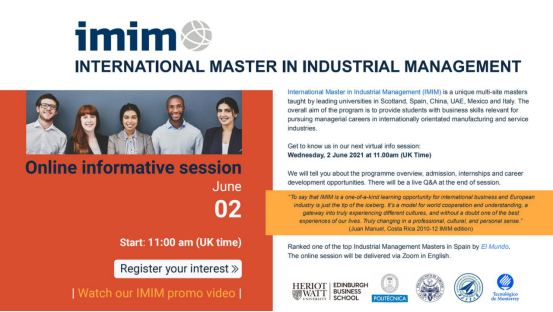 2021年6月2日晚,银河集团官网参加IMIM工业管理国际硕士联合培养项目信息交流会,此次会议于Zoom进行,公司经理助理邵婧参加了此次会议。会议由来自西班牙马德里理工大学的Isaac Lemus-Aguilar教授主持。