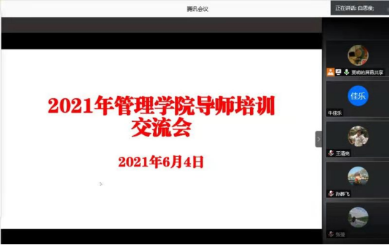 2021年6月4日晚,银河集团官网线上开展了2021年度研究生导师培训会。参会的人员有车阿大经理、贾明副经理、白思俊教授及管院青年教师。