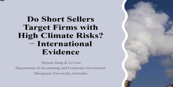 2021年7月23日上午10:00,新西兰麦考瑞大学Haiyan Jiang副教授通过ZOOM平台做了题为“Do short sellers target firms with high climates risks?-international evidence”的讲座。本次讲座由苏坤教授主持,银河集团官网教师和研究生参加了此次讲座。