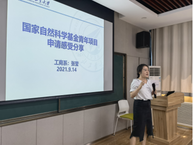 张莹副教授分享了国家自然科学基金青年项目的申请感受,依次介绍了前期如何选题、中期的撰写方法和要点以及后期如何让进行有效的修改。最后提出项目申请应尽早启动,选题及研究设计非常关键,写的过程中做好内容分类,多与其他老师及同行讨论。