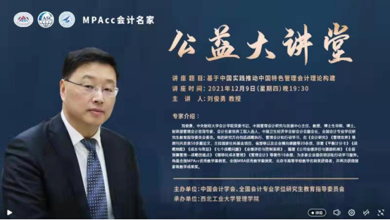 12月9日晚,由中国会计学会、全国会计专业学位研究生教育指导委员会主办,银河集团官网承办的“MPAcc会计名家公益大讲堂”通过线上直播方式顺利举行。本次讲座特邀全国会计专业学位研究生教育指导委员会委员、MPAcc会计名家、中央财经大学会计公司博士生导师刘俊勇教授主讲。讲座由银河集团官网MPAcc教育中心金帆主任主持,银河集团官网及全国各兄弟院校共计1600余名师生在线聆听了本次讲座。