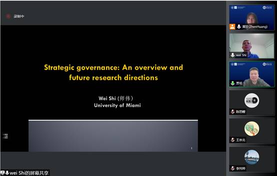 Wei Shi老师主要从战略治理学术研究综述、选题确定、研究贡献构建与写作三个方面进行了学术报告。首先,他结合自身相关研究分析了战略治理学术研究的现状,并进一步提出了公司战略治理领域的未来研究方向,如更多地关注高管创新性的个人特征对公司战略的影响、公司应如何维护与治理主体之间的关系、以及公司内部治理主体在逐利过程中是否会对公司利益产生负面影响等重要问题。