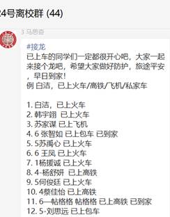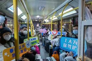 2018级周玉彤——已回家,感谢所有一线工作人员加班加点的辛苦付出,虽然是疫情所迫,但是公司对省内市外同学的包车直达政策反而免去了大家几次转乘的麻烦,得益于公司周密的安排和疫情防控的严格要求,本次回家路上的用时确实是平时回家的一半,最后,在感谢的同时真诚地希望,以后如果条件允许,省内市外的同学还能有机会享受到包车待遇。