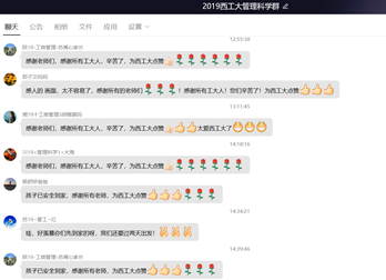 每位员工家长都在急切的等待着员工回家。公司辅导员在做好员工工作的同时,及时将公司的离校安排告知家长,赢得家长对公司的认可和赞誉。家长们通过辅导员在家长群里的发照片和视频,看到深夜一辆辆开进校园的车队、看到凌晨老师们陪同员工一起在乘车点候车、看到公司为同学们发放的爱心卡片、看到同学们拿着“工大,我爱你”的标牌拍照时的开心笑容,被深深的打动了,“为西工大点赞”“为是西工大的学子而骄傲”!