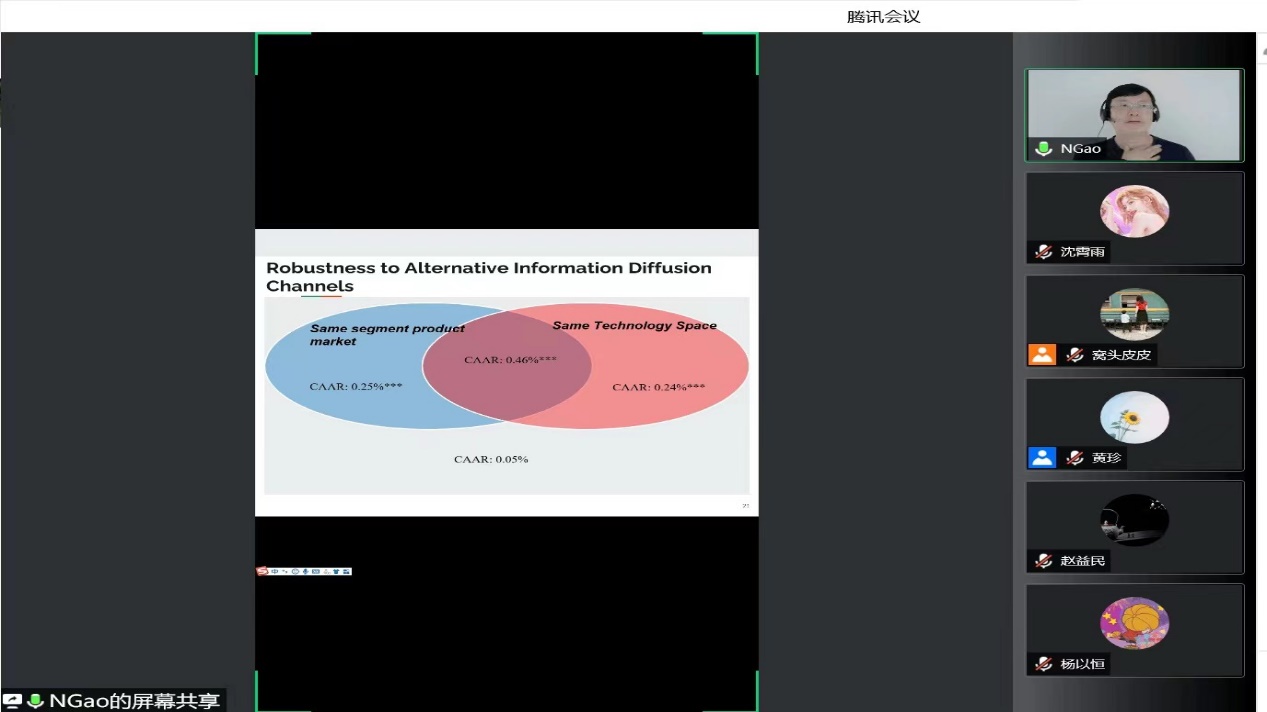 高伟伟对高宁的到来表示热烈欢迎,并对高宁做了简单的介绍。讲座中,高宁从案例出发,发现当阿斯利康公司同意以高价购买剑桥抗体技术公司时,它的同行Medarex生物技术公司的股票会随之上涨,由此提出问题:“公司并购是否传递以及如何传递有关技术价值的信息?它的作用机制如何?”他用以下三种理论解释这种现象发生的可能性:一是信号传递机制:并购公告会释放积极信号,让同行获得技术协同效应的共同成分和收购概率,从而提高同业公司的股价。二是投资增强假说:并购公告也标志着对同行技术资源需求的增加,激励同行加大研发投入,刺激股价上涨。三是竞争平衡假说:并购减少了技术空间的竞争,让同行占据更多市场。另一方面,并购也带来了强大的竞争对手,两者共同影响同业公司的股价变动。
