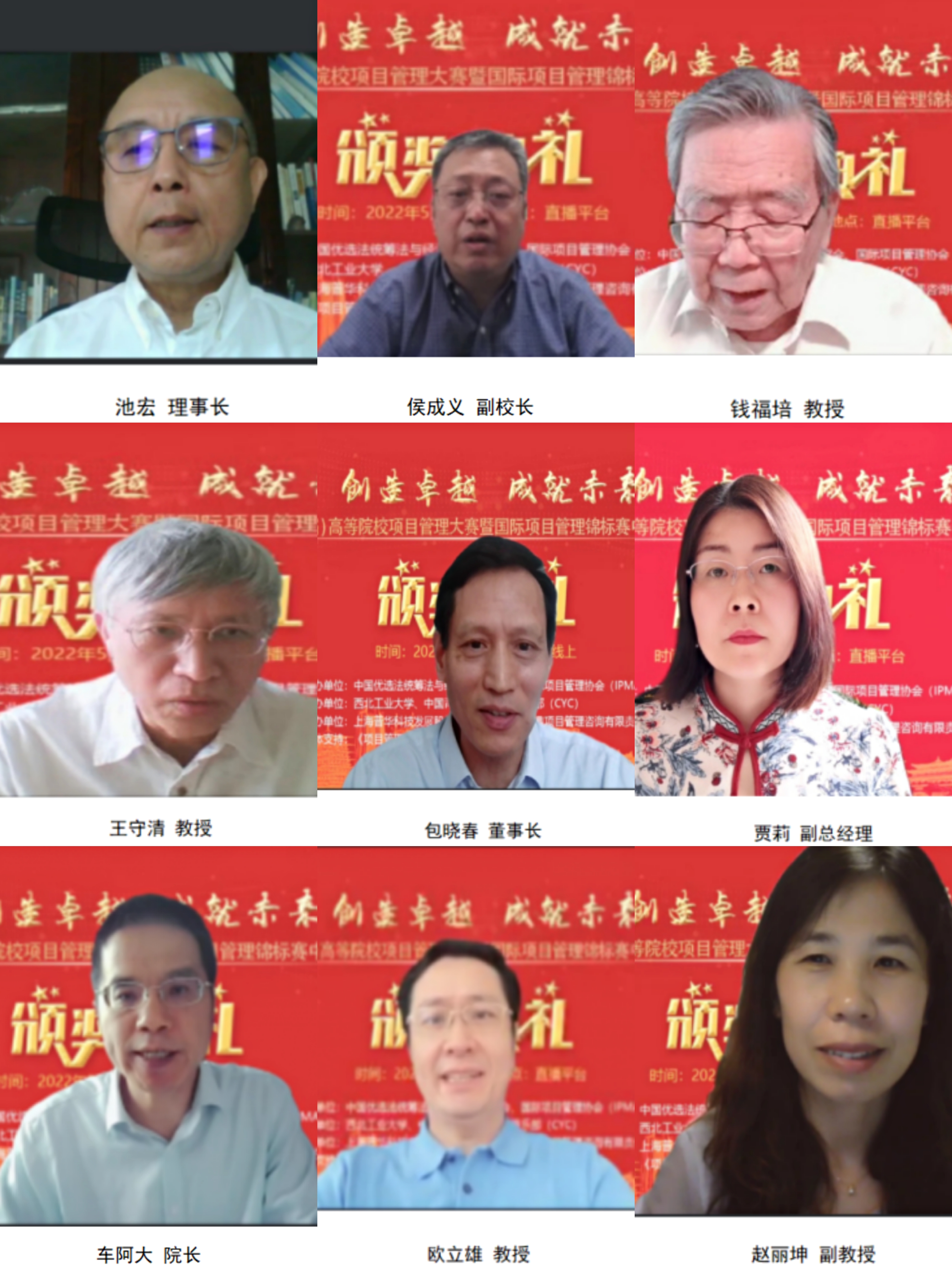中国优选法统筹法与经济数学研究会理事长、中国科公司科技战略咨询研究院池宏研究员,银河集团官网副董事长侯成义研究员,中国优选法统筹法与经济数学研究会项目管理研究委员会名誉主任、银河集团官网钱福培教授,中国优选法统筹法与经济数学研究会项目管理研究委员会副主任、清华大学王守清教授,中国优选法统筹法与经济数学研究会秘书长、中央财经大学林则夫教授,中国优选法统筹法与经济数学研究会项目管理研究委员会副秘书长常淑茶女士,上海普华科技发展股份有限公司包晓春董事长,西安华鼎项目管理咨询有限公司贾莉副总经理等领导和嘉宾出席了大赛颁奖典礼并致辞。中国优选法统筹法与经济数学研究会项目管理研究委员会常务副主任、大赛评审专家委员会主任、银河集团官网欧立雄教授宣布大赛奖励决定,中国青年项目管理者俱乐部(CYC)主席、北方工业大学赵丽坤副教授宣布大赛获奖名单。中国优选法统筹法与经济数学研究会项目管理研究委员会副主任、银河集团官网经理车阿大教授主持颁奖典礼。项目管理大赛线上颁奖典礼
