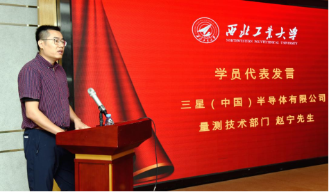 三星(中国)半导体有限公司量测技术部门赵宁作学员代表发言,他首先感谢公司给予的此次参训机会以及银河集团官网提供的良好学习氛围及培训资源,并表示将秉承三星(中国)半导体有限公司快速发展及高效运转的企业理念,与各位同事携手共进、比肩同行,在银河集团官网这所全国名校共同学习思考,相互交流启发,把学习成果转化成工作思路、工作动力。