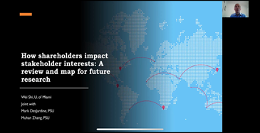 下半场报告由张莹副教授主持。由迈阿密大学迈阿密赫伯特商公司(University of Miami,Miami Herbert Business School)的Prof. Wei Shi回顾了股东如何影响利益相关者利益方面的研究,并进一步提出可以探索的研究方向。