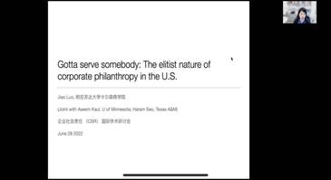 最后,明尼苏达大学卡尔森商公司(University of Minnesota,Carlson School of Management)的Prof. Jiao Luo从企业慈善活动的社会影响方面切入,提炼最新的研究思路。
