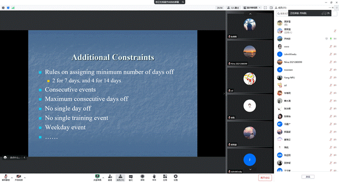 会议伊始,周琛淏向大家介绍了齐向彤教授。齐教授向老师和同学们介绍了香港科技大学的地理位置及其优美的校园环境;接着,他就其所承担的各类工业项目,阐述了业界与学界之间的交互耦合、工业项目与科研工作的相互依存关系。齐教授主要介绍了6种工业问题,包括第三方物流公司内部运作问题、航空公司飞行员培训安排问题、邮政中心机器与操作人员调度问题、仓库外车辆调度问题、集装箱码头堆场调度问题和机场转运车辆运作规划问题。