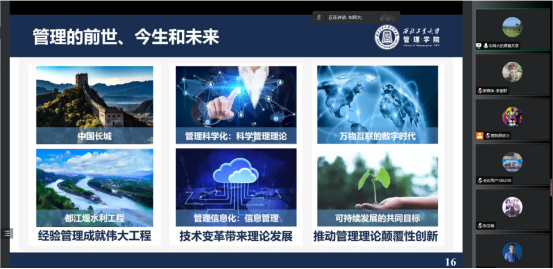 车阿大以“钱学森敏锐意识到运筹学在社会主义建设中的作用”及“钱学森将系统思想与系统理论运用于国防事业”的故事,指出在航空科研领域中“三分靠技术,七分靠管理”,以此表明管理学在国家发展中的巨大作用。并下出明确定义,即:管理是针对特定对象的研究,它通过系统角度思考问题,并运用管理科学的方法,从而使社会更加有序、高效!在“管理”定义的基础上,车阿大对目前“管理科学与工程”、“工商管理”两个大类下的团队建设情况做以简要介绍。从长城、水利工程,到技术变革背景下的信息管理,甚至是可持续发展愿景下的低碳管理,通过这一脉络讲述了管理的前世、今生和未来,新生们对管理有了更加深入的了解和更加宏观的把握。