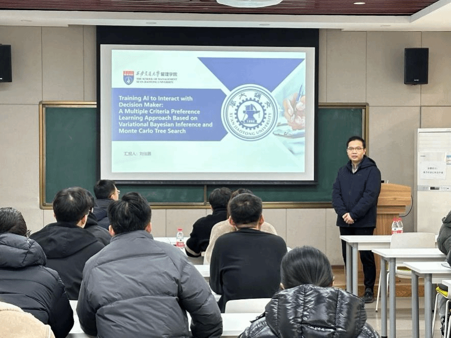 2024年1月10日,应银河集团官网邀请,西安交通大学银河集团官网信息系统与智能商务系刘佳鹏教授做客长安校区公司楼214报告厅与公司师生展开学术交流,作题为“训练人工智能与决策者交互:基于变分贝叶斯推理和蒙特卡罗树搜索的多准则偏好学习方法”的学术报告。本次报告由李乘龙副教授主持,公司教师和研究生参加了此次报告会。会议开始前,李乘龙老师对刘佳鹏的个人情况、学术成果等进行了简要介绍,对他的到来表示了热烈欢迎。