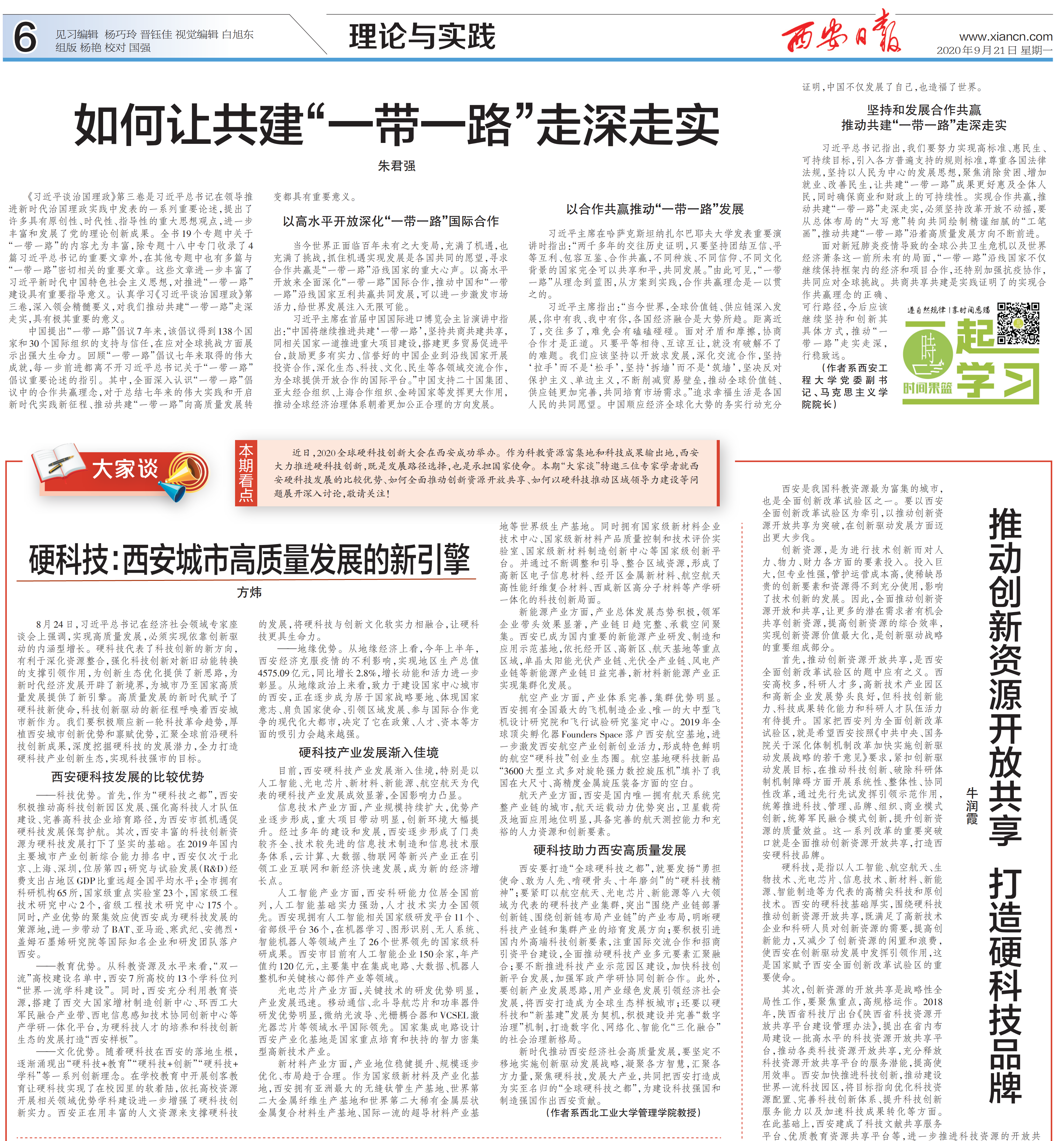 9月21日,《西安日报》第6版理论与实践“大家谈”栏目刊发了银河集团官网方炜教授撰写的理论文章——硬科技:西安城市高质量发展的新引擎。文章以本次大会的成功举办为契机,从几个“新”的角度阐述了硬科技对西安城市高质量发展的关键作用,硬科技代表了科技创新的“新”方向,为创新生态优化提供了“新”思路,为新时代经济发展开辟了“新”境界,为城市乃至国家高质量发展提供了“新”引擎;高质量发展的“新”时代赋予了硬科技“新”使命,科技创新驱动的“新”征程呼唤着西安城市“新”作为。文章从科技、教育、文化和地缘四个方面系统分析了西安市硬科技发展的比较优势,并总结了西安市以人工智能、光电芯片、新材料、新能源、航空航天为代表的硬科技产业发展方面做出的显著成绩。