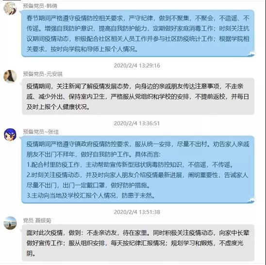 2月11日、14日支部同志们统一学习 “张定宇”等人的先进事迹,各位党员同志线上发表自己的学习感悟,虽然我们不能和医生一样战斗在第一线救死扶伤从,研制对抗病毒的疫苗,但是我们应该尽己所能,号召周围的群众做好防控工作,面对谣言能够做到“不信谣,不传谣”;关注相关新闻报道,了解疫情防控措施和情况;注意个人卫生,服从统一安排。