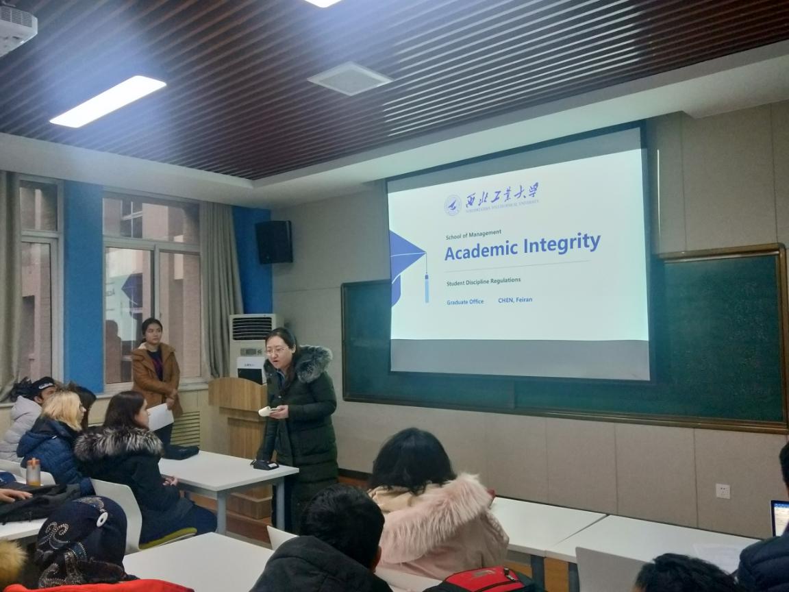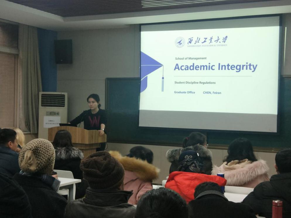 2018年12月27日下午4点,在210报告厅举办了职工学术纪律说明会,说明会面向全体职工,主要内容包括向硕博职工同学们介绍毕业论文审核要求及注意事项,以及公司的考勤制度。参加说明会的老师有副经理贾明、英文职工班主任邵婧、研究生教学秘书陈斐然和国际教育公司职工辅导员姬老师、韩老师。说明会由外事秘书王霄主持。