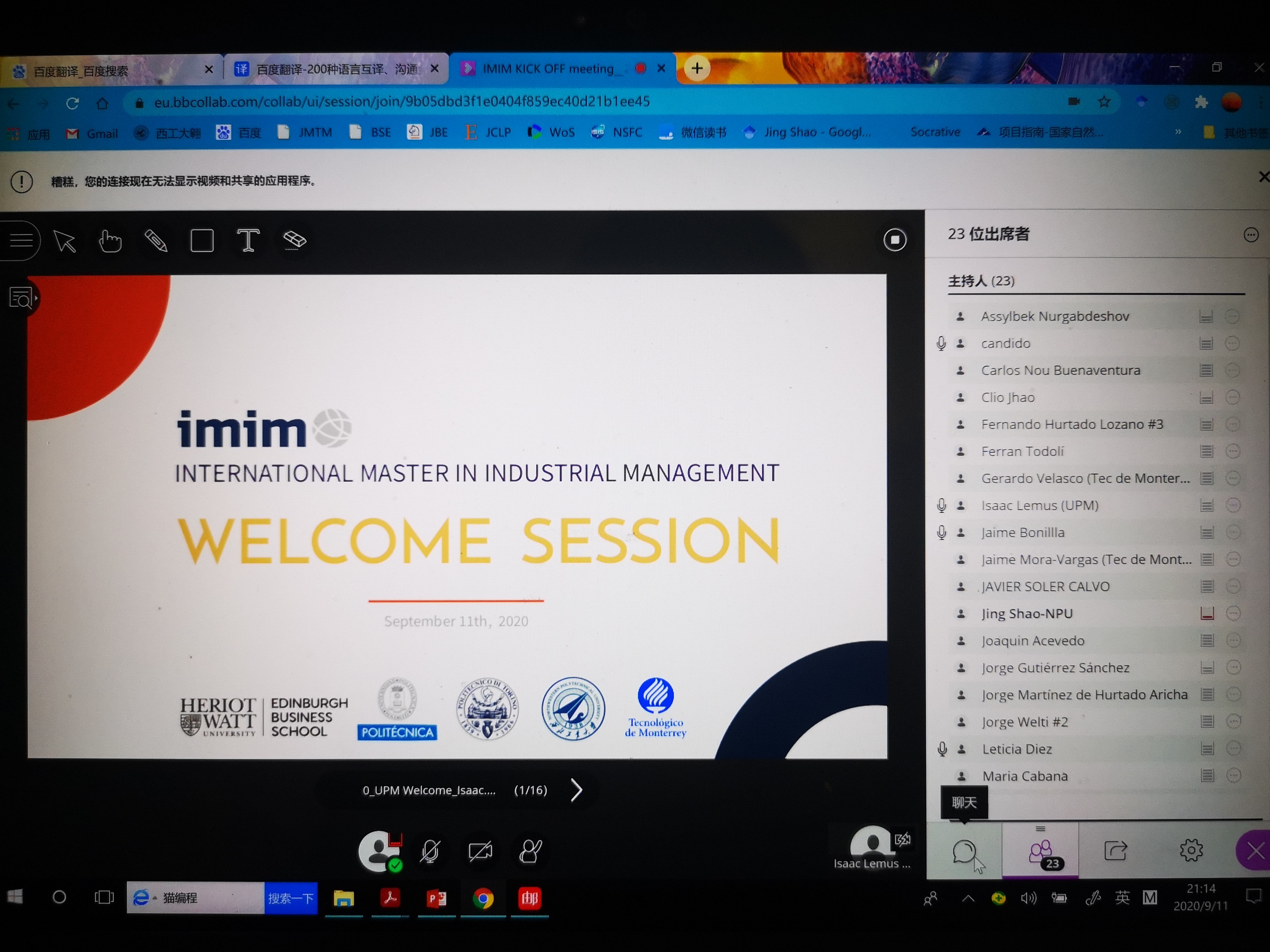 北京时间9月11日晚上8点,IMIM项目启动会准时召开,参与本项目五所合作院校的代表全部参会。会议首先由西班牙马德里理工大学工业工程公司的Isaac Lemus教授致辞,并向其他合作院校简要介绍了2020-2022年IMIM项目的实施情况。本项目面向全球招生,通过层层筛选,最终今年有11人入学,包括9名来自欧洲的员工和2名来自亚洲的员工。西班牙马德里理工大学的项目负责人Susana Moreno介绍了本项目的协议签署情况,包括项目协议、数据共享协议及员工协议。随后,西班牙马德里理工大学的Candido Barrena介绍了本项目的预算情况、硕士论文撰写规则等事宜。最后,由Isaac Lemus教授向大家作2021-2023年度IMIM项目的宣传计划,并公布了下一届员工的申请截止时间:非欧盟员工申请截止时间为2021年5月30日,欧盟员工申请时间截止为2021年7月31日。