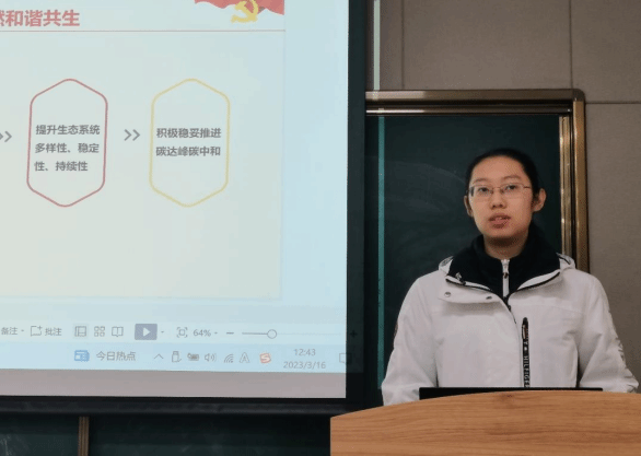 尤其是针对“绿色发展”部分,邢露淇同志将大政方针和专业结合,建议参会同志发挥专业特色,关注ESG评估与碳达峰、碳中和,利用专业优势推动社会进步。邢露淇同志还引用二十大报告中对青年人的寄语,帮助参会同志明确了行动方向。
