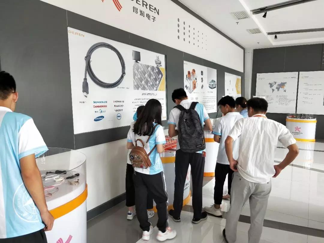 我们首先在接待员的带领下参观了公司的展厅。展厅中精细的产品也无不体现了接待员向队员们介绍的得润电子公司的经营理念:品质、服务、成本、创新。而展厅中直接安装在产品上的零部件也更加直观的向实践队成员们展示其产品的精密性和重要性。