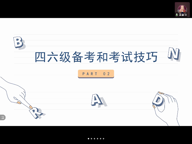 第一位进行分享的是黄嘉琪同学,她主要通过写作、听力、阅读、翻译四类题型进行技巧讲述。