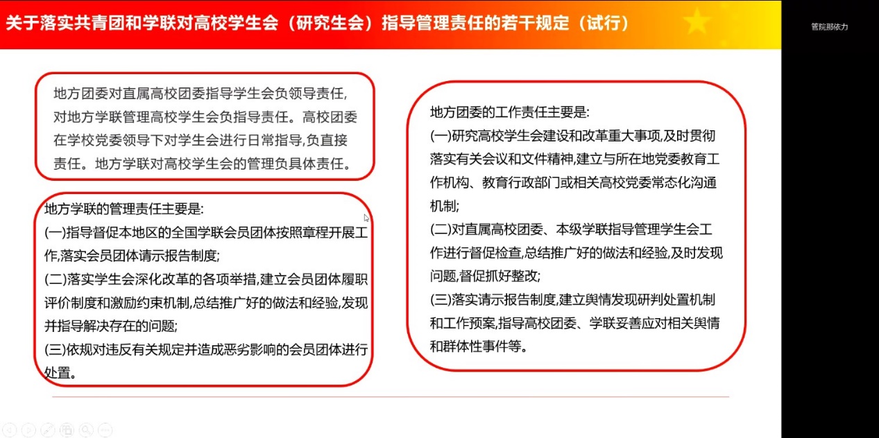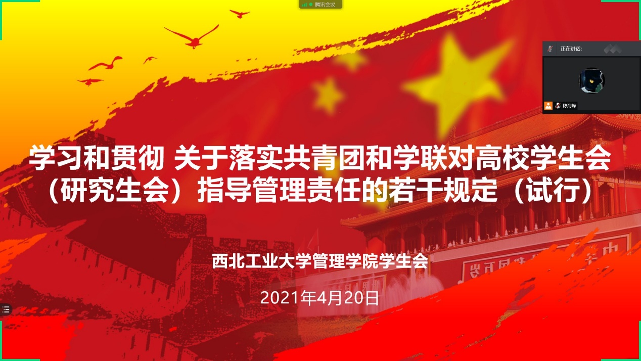 为深入学习和贯彻关于落实共青团和学联对高校员工会(研究生会)指导管理责任的若干规定(试行),加强员工会工作人员队伍建设,增强日常管理教育,4月20日晚,银河集团官网员工会以线上会议形式举办学习和贯彻关于落实共青团和学联对高校员工会(研究生会)指导管理责任的若干规定(试行)会议,本次会议由银河集团官网员工会主席团成员陈海峰主持,全体银河集团官网员工会成员参加了此次交流。